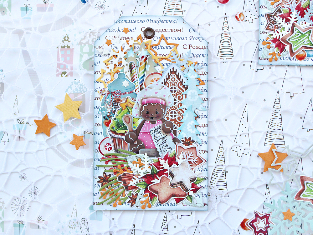 Когда я увидела картинки с этими забавными человечками, возникла ассоциация со своей семьей. Дело в том, что моя невестка Яна печет праздничные пряники. И этот тег пряничного человечка с рецептом напомнил мне Яну. В декоре я добавила пряничный домик, пирожное в виде новогодней елочки, банку с испеченными вкусностями, пряники на фоне снежинок и елочных веток.