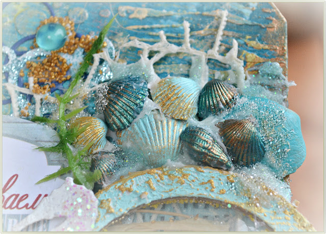 Брызги волн и пена морская - это море микробисера: голубой и бирюзовый ТМ ЕК, прозрачный - "Хрустальный "от ФД. Сажала его на прозрачную текстурную пасту ТМ ЕК и местами покрывала текстурной пастой "Хрустальный лед" с мерцающими голубыми шариками тоже ФД.