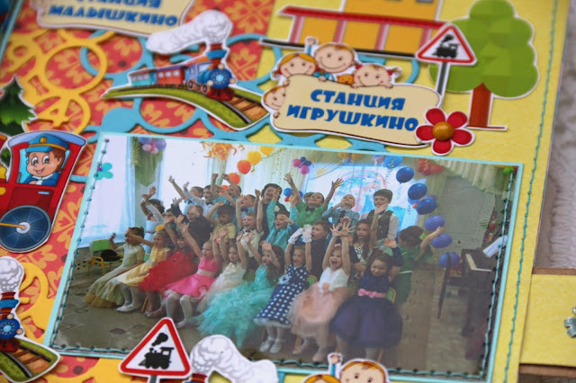 Взяв в интернете за основу картинку деток и рамки, в фотошопе написала название станций и распечатала на фотобумаге. Также распечатала и другие, подходящие к этой теме, картинки из интернета. Акцентирует приезд поезда на станцию Школьная деревянная пуговка.